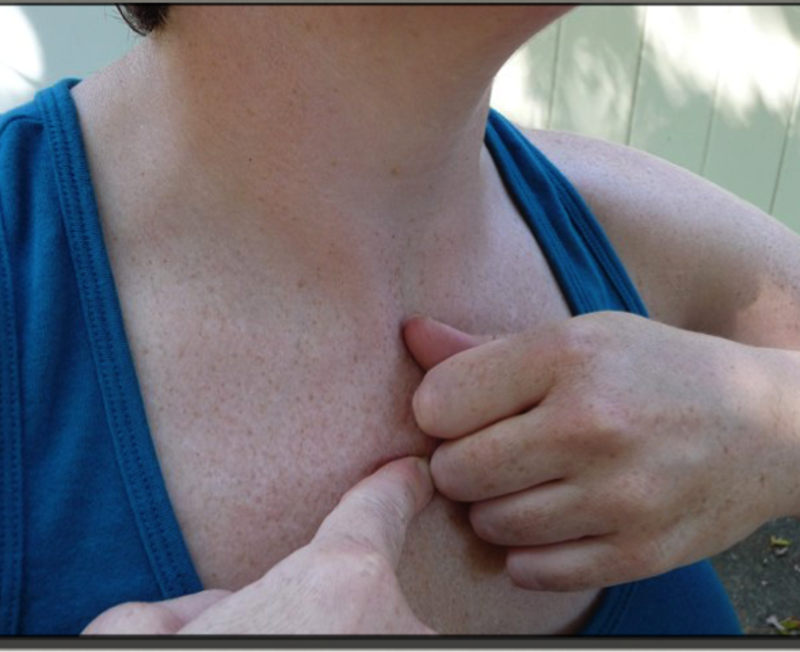 1. Gently rest your thumb on the suprasternal notch (fossa jugularis sternalis), also known as the jugular notch. It is the visible dip where the clavicles join the sternum.